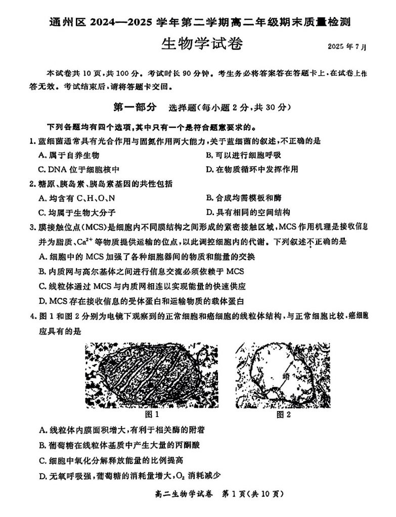 2025年北京各区高二(下)期末考已陆续开始进行,admw360教研组整理了2025北京通州高二(下)期末生物试题,分享给大家。