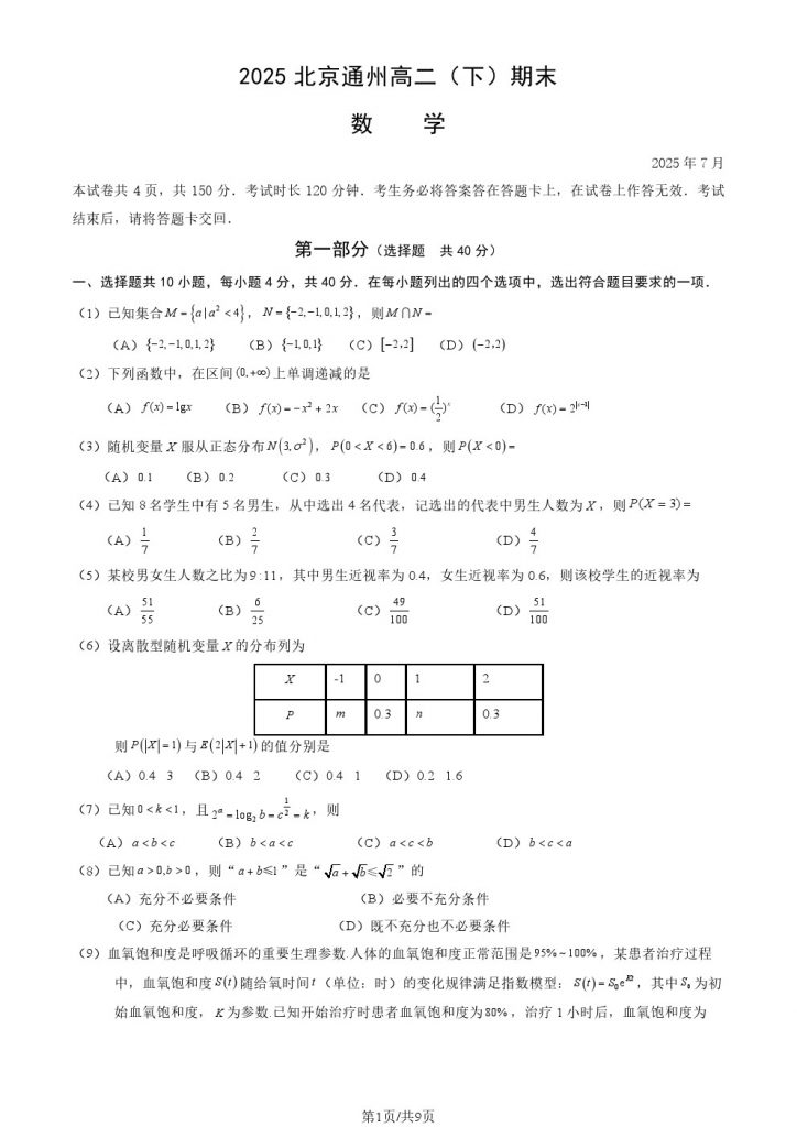 2025年北京各区高二(下)期末考已陆续开始进行,admw360教研组整理了2025北京通州高二(下)期末数学试题及答案,分享给大家。