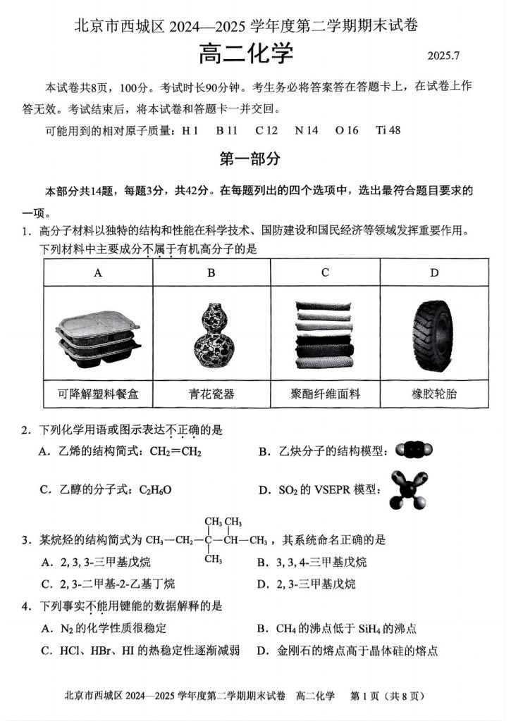 2025年北京各区高二(下)期末考已陆续开始进行,admw360教研组整理了2025北京西城高二(下)期末化学试题及答案,分享给大家。