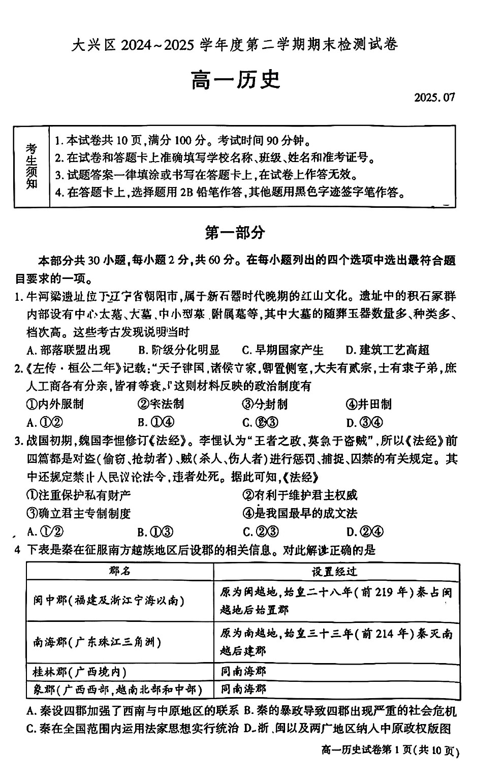 2025年北京各区高一(下)期末考已陆续开始进行,admw360教研组整理了2025北京大兴高一(下)期末历史试题及答案,分享给大家。