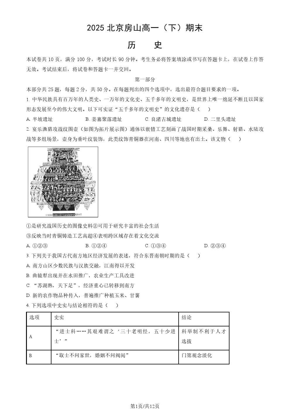 首页 高一资料 2025北京房山高一(下)期末历史试题及答案