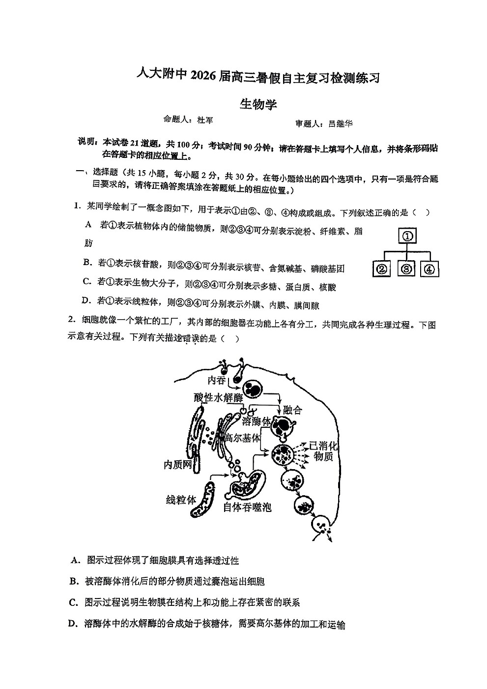 admw360教研组整理了北京人大附中2025年高三开学考生物试题,看看都考了哪些内容?