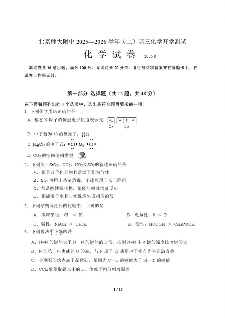 admw360教研组整理了2025北京北师大附中高三(上)开学考化学试题,看看都考了哪些内容?