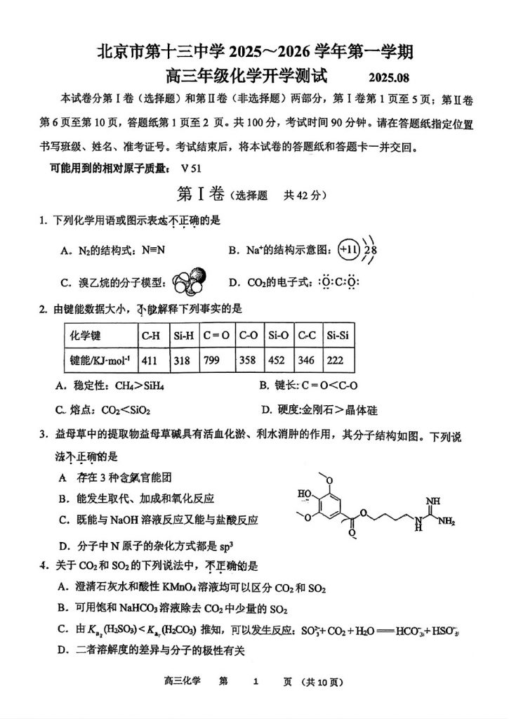 admw360教研组整理了2025北京十三中高三(上)开学考化学试题,看看都考了哪些内容?