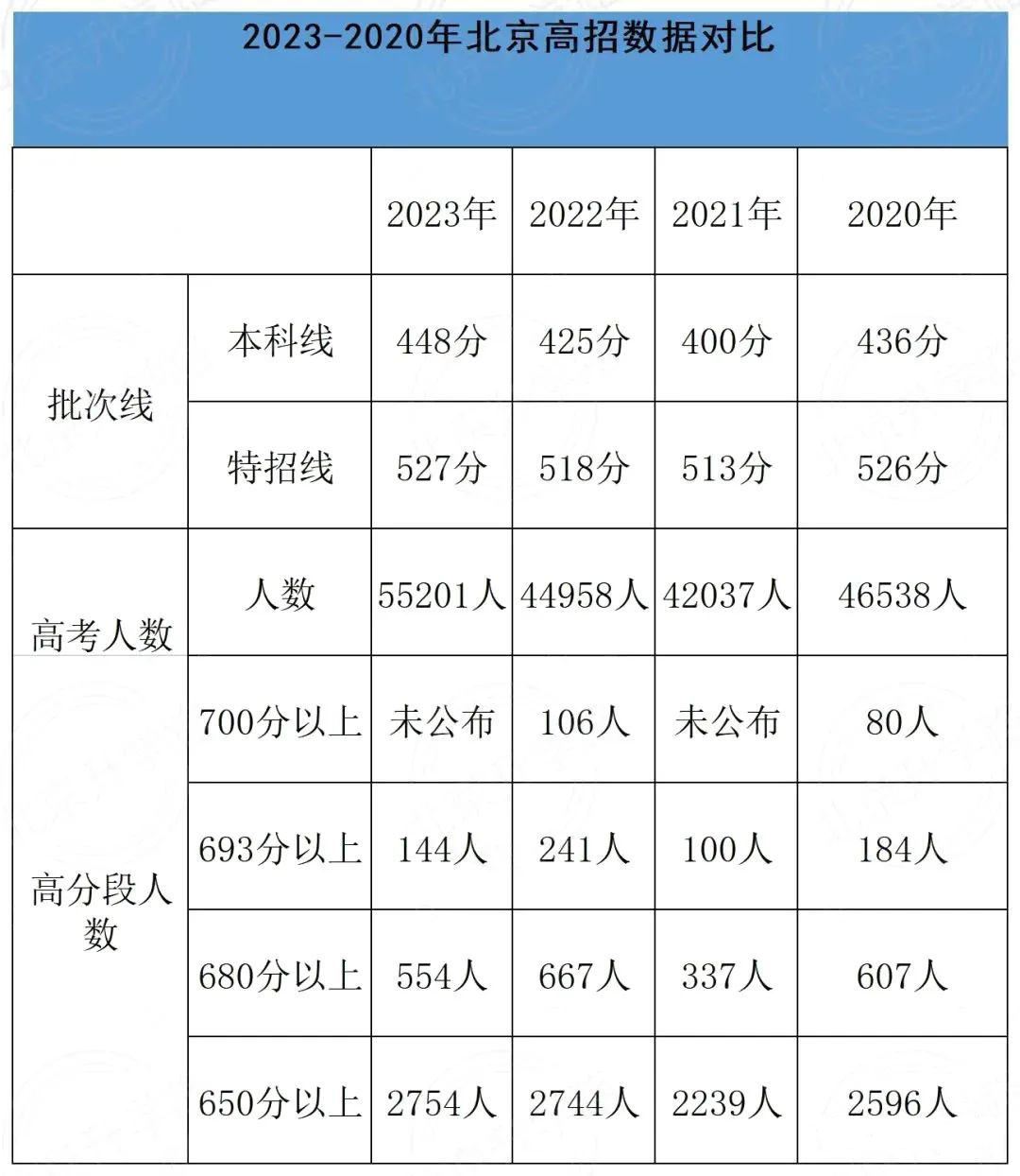 以下为2020-2023年北京市高招本科普通批录取最低分及市排名数据: