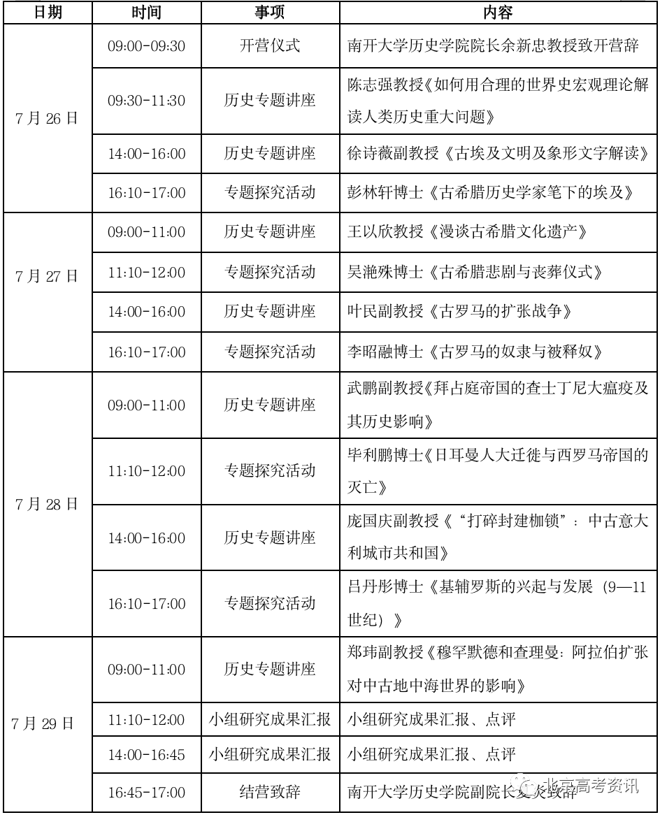 注:具体课程时间和内容安排根据实际情况可做出适当调整。南开大学历史学院对参加全部教学环节并考核合格者颁发暑期学校结业证书,根据结业营员表现组织评优与颁奖。