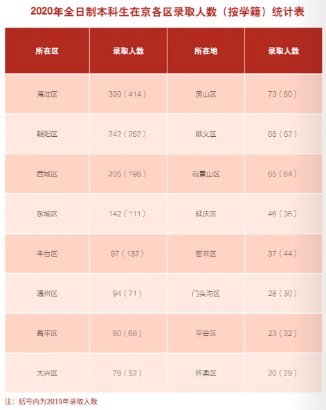 从下表数据可以看到,首经贸近两年海淀区录取人数最多,其次是朝阳区。从两年录取数据对比来看,2020年录取人数相较2019年有所降低。