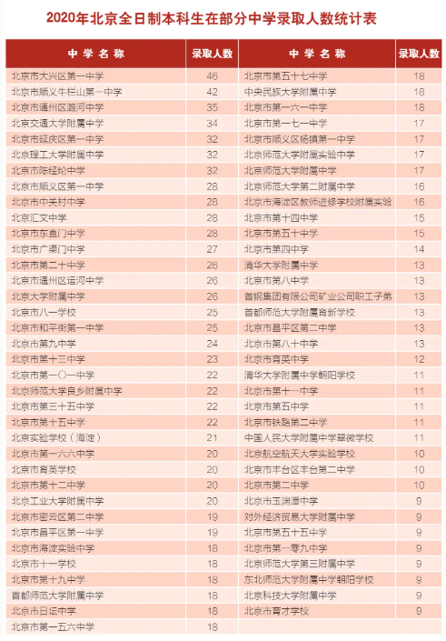 首经贸2020年在大兴区第一中学录取人数最多,其次是牛栏山一中,录取人数超过40