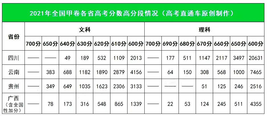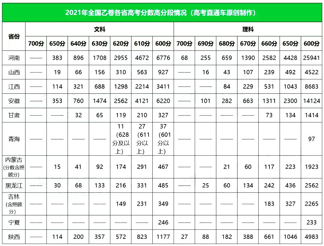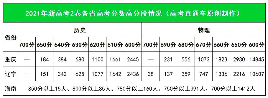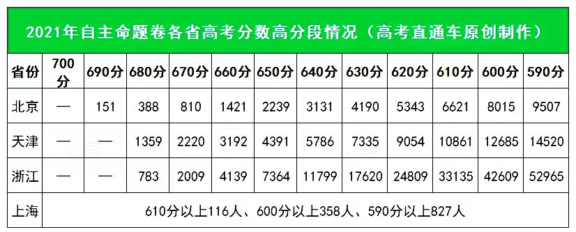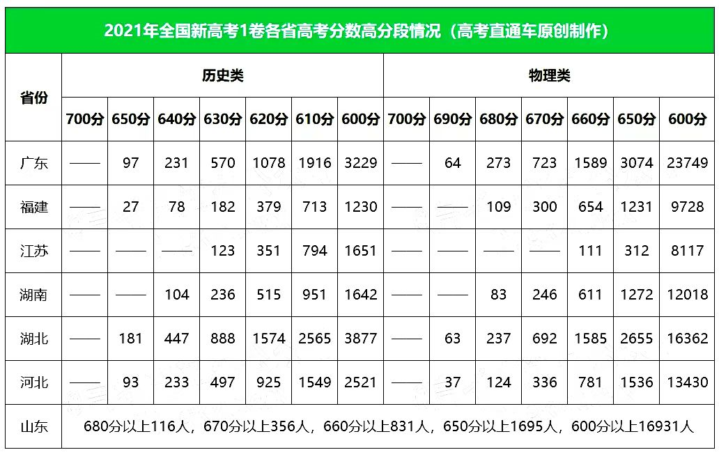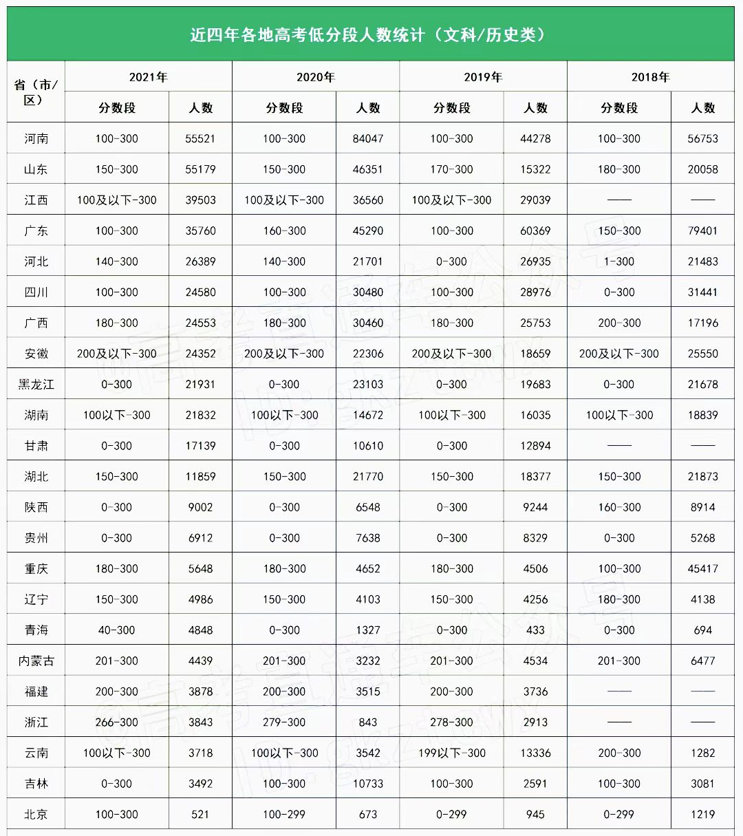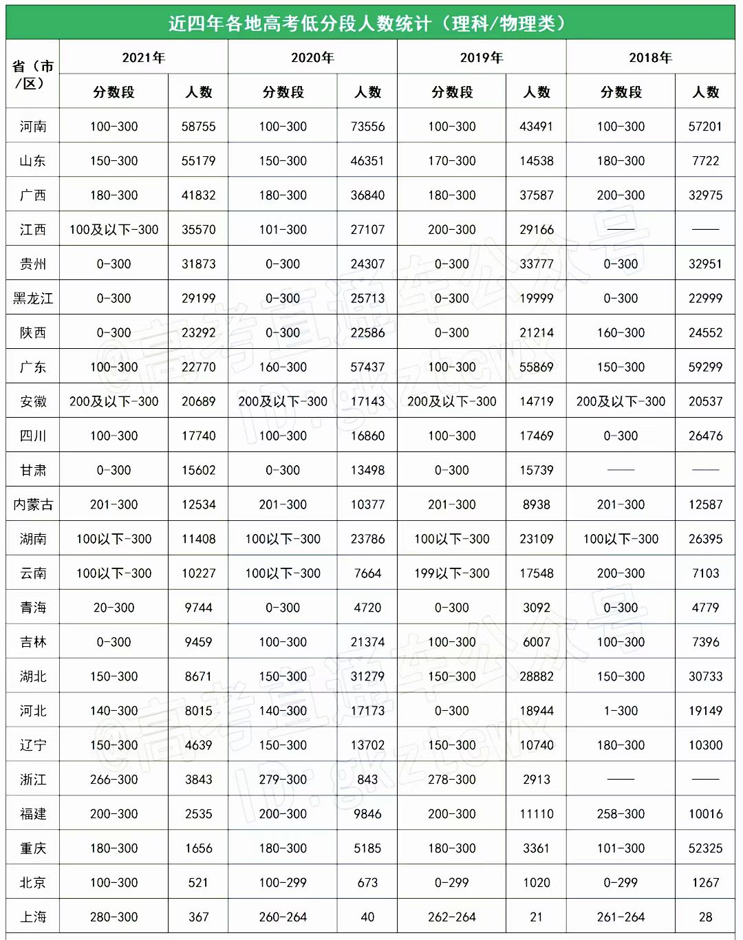说明:表格数据由高考直通车整理自各地2018-2021年高考一分一段表,仅供参考,如有错漏,请以官方公布为准。因部分省份未公布低分段人数,故不纳入统计。北京、天津、浙江、山东不分文理科,2个表都加入是为了方便比较。