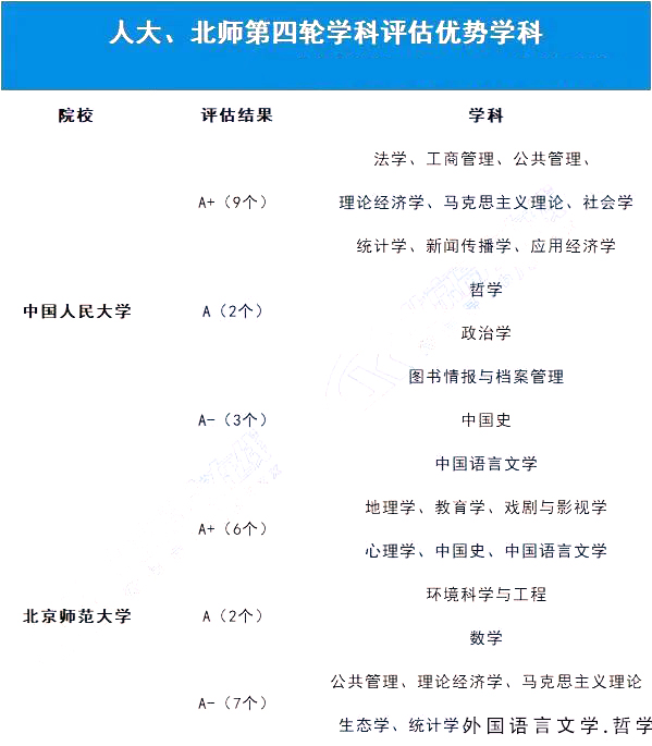下表整理了在第四轮学科评估中,人大、北师的学科评估结果: