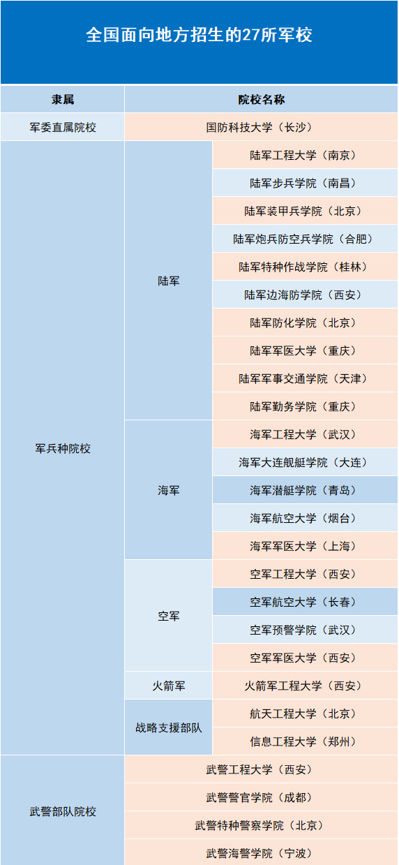 面向高中生招生的27所军校名单