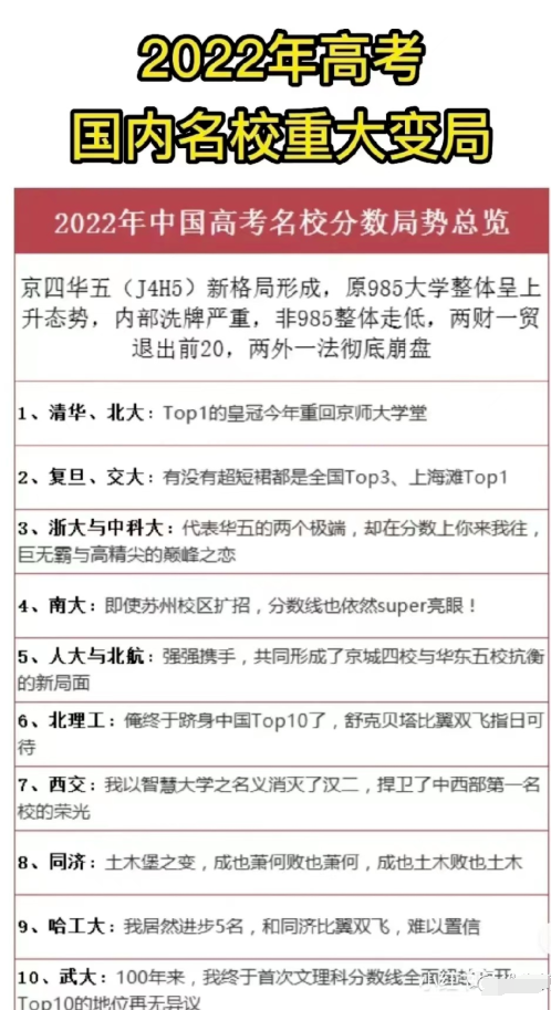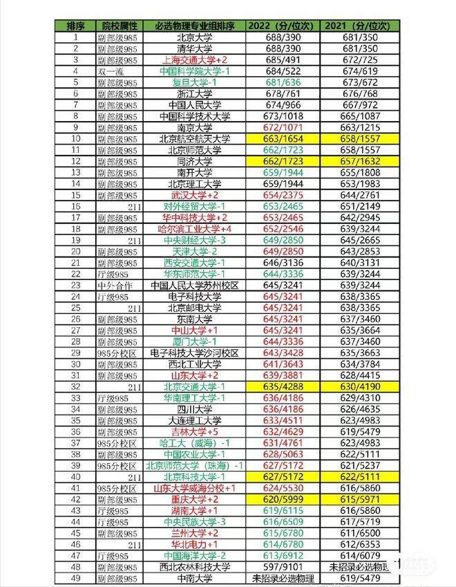 其次第二条985大学总体呈上升趋势,但是内部竞争十分激烈。985大学已经展露出和211大学不一样的“气质”了。今年的考生不会再像以往一样,为了留在本地而放弃更好的学校和专业,985大学的整体录取分数和排位在各省市都有着提升。同时,985高校内部之间的竞争和分化也是比较严重。我们可以看到哈工大、北理的再度崛起,同济大学的一蹶不振,武汉大学在疫情过后貌似又找回来昔日的荣光等等。985大学也由于其各自的侧重点不同,内部集团频繁地更换座次。这也导致了今年很多高考录取生出现断档以及踏空的现象。