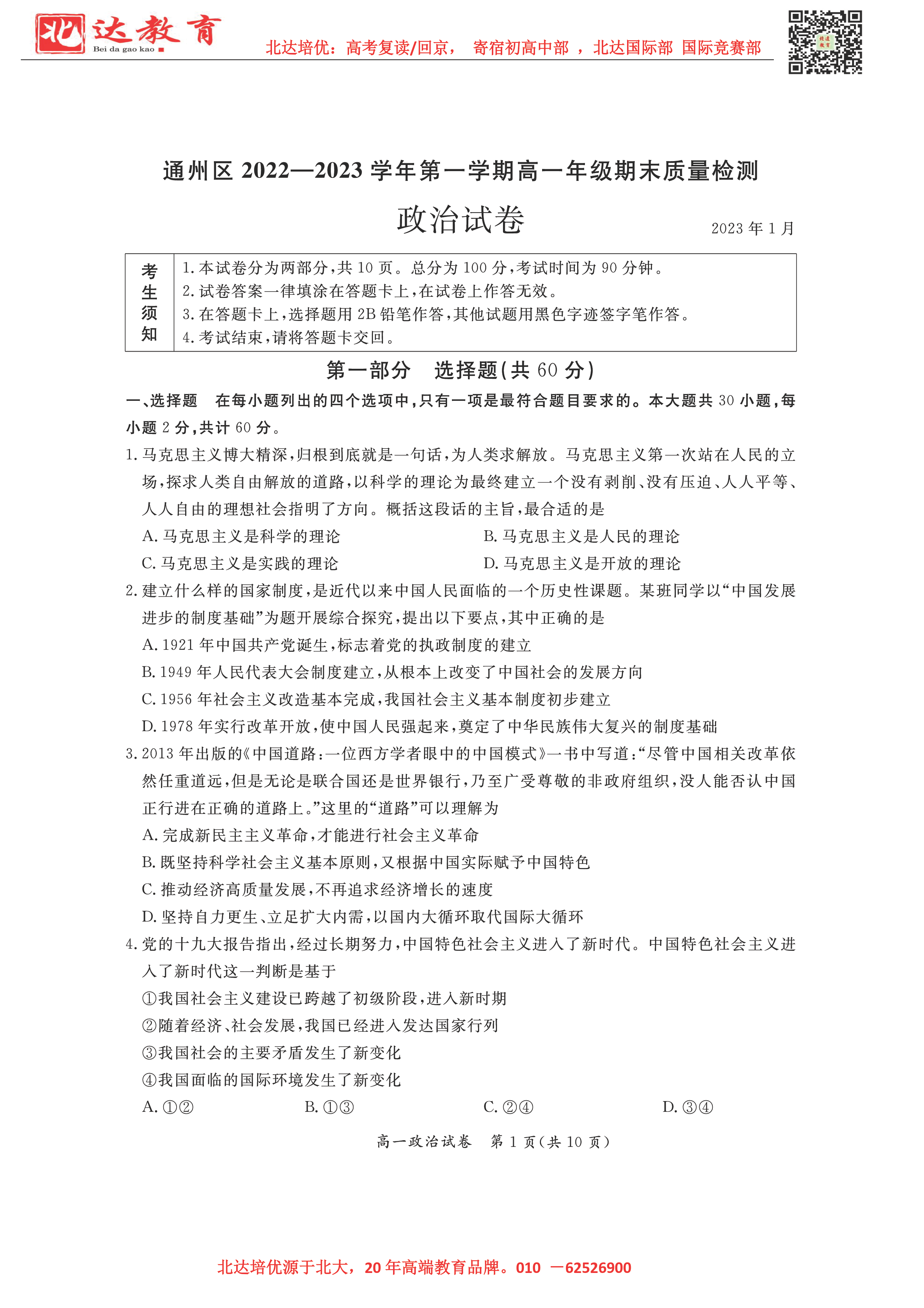 温馨提示:北京各区2022-2023学年高中各年级期末试卷&答案汇总电子版,可加老师微信进群免费获取