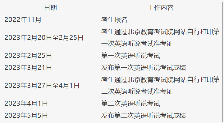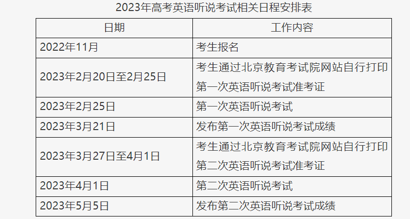 北京市高考英语听说考试采用计算机考试模式,实行一年两考。2023年高考第一次英语听说考试于2023年2月25日进行,第二次英语听说考试于2023年4月1日进行。