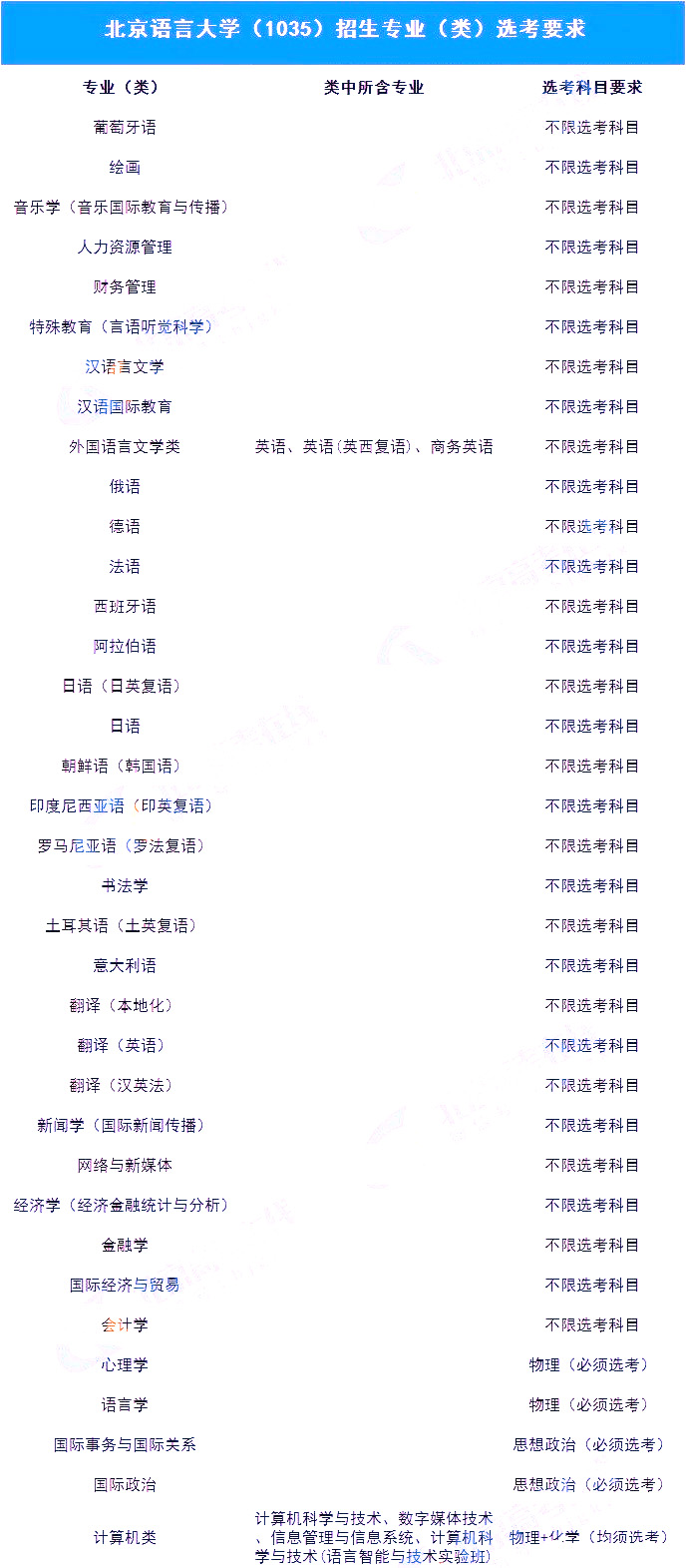 以北京大学为例:2022年北京大学的选科要求(执行2020版选科要求)大体上可以分为4类:不限选考科目;限选政治(唯一专业);物理、化学二选一;限选物理。
