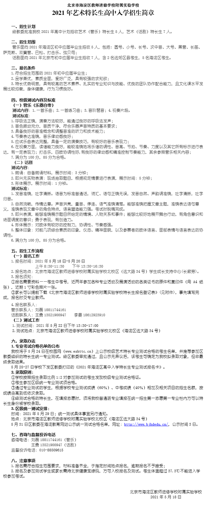 首页 特长招生 2022考生参考:2021年海淀进附属实验学校中考艺术特长生招生简章