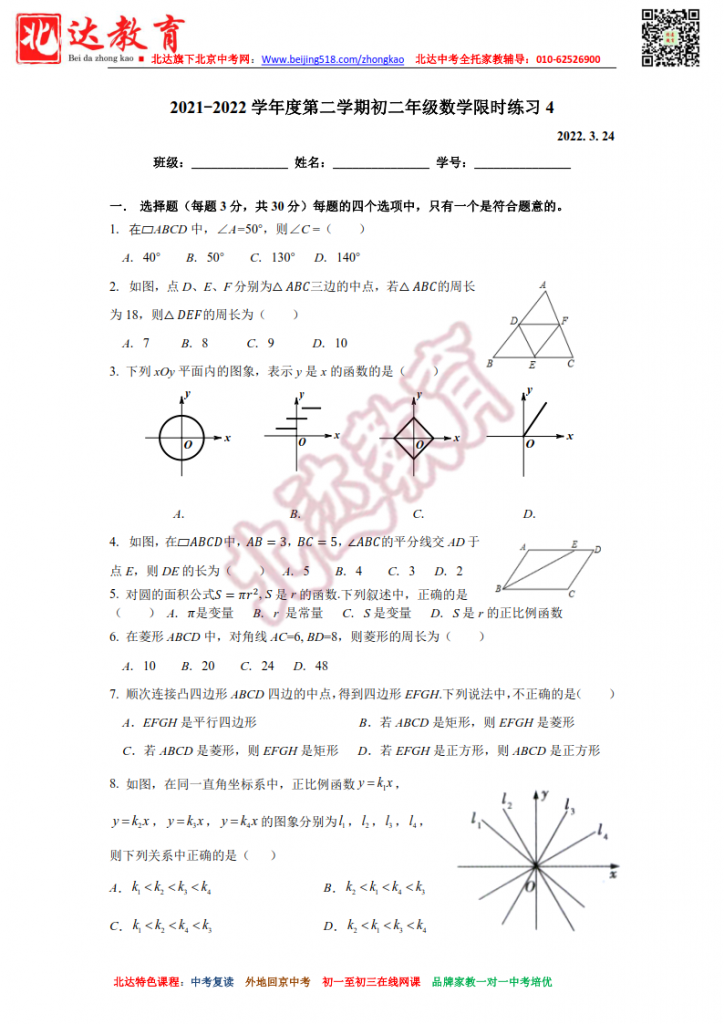 人大附中20220324初二下数学限时练习 4。admw360中考复读学校教研组收集整理,分享给大家。