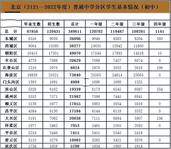 2021~2022学年北京各区初高中毕业生数、招生数、在校生数。