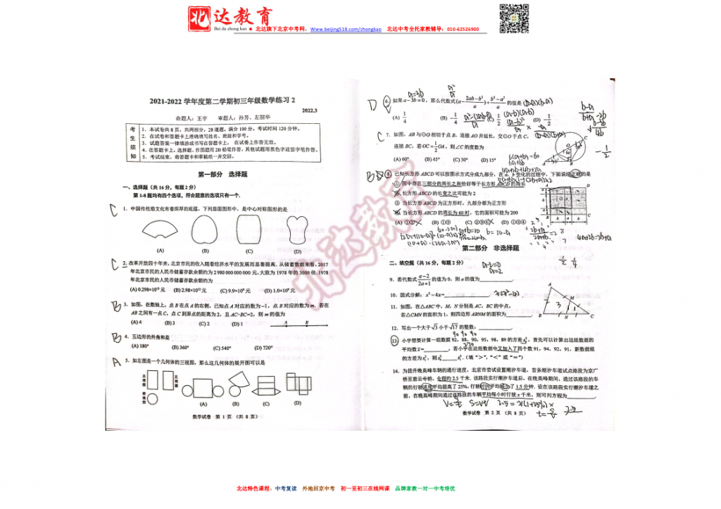 人大附中2022年三月月考数学试卷。admw360中考复读学校教研组收集整理,分享给大家。