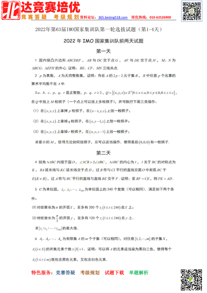 2022第63届IMO国际数学奥赛国家集训队第一轮选拔试题(第1-4天)。admw360中考复读学校教研组收集整理,分享给大家。