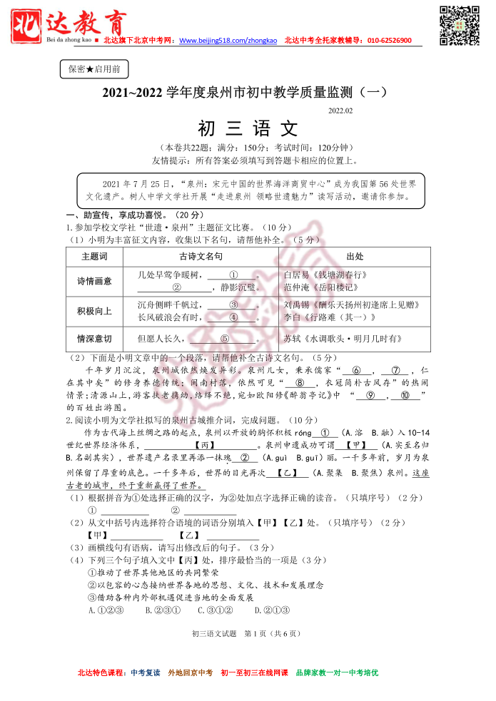 福建泉州2022初三一模全科试卷及答案。admw360中考复读学校教研组收集整理,分享给大家。