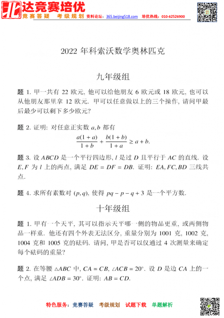 2022年科索沃数学奥林匹克竞赛试题(9-12级)。admw360中考复读学校教研组收集整理,分享给大家。