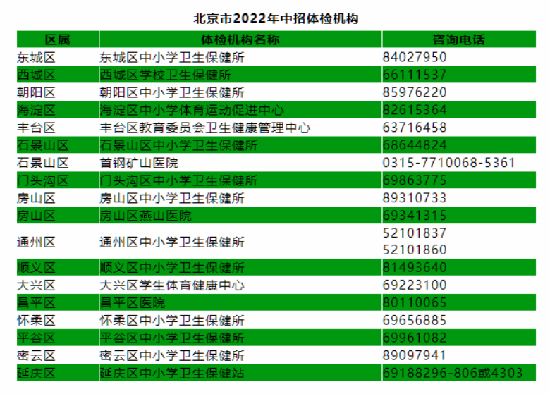 全市中招体检会诊时间为3月1日至4月30日,每周三13:30-15:30,地点为北京市体检中心马甸部。各保健所提前一天将会诊学生相关体检信息报北京市体检中心专项业务科(电话68024448)备案;会诊时,学生需携带各区保健所开具的会诊单及本人身份证或学生证。