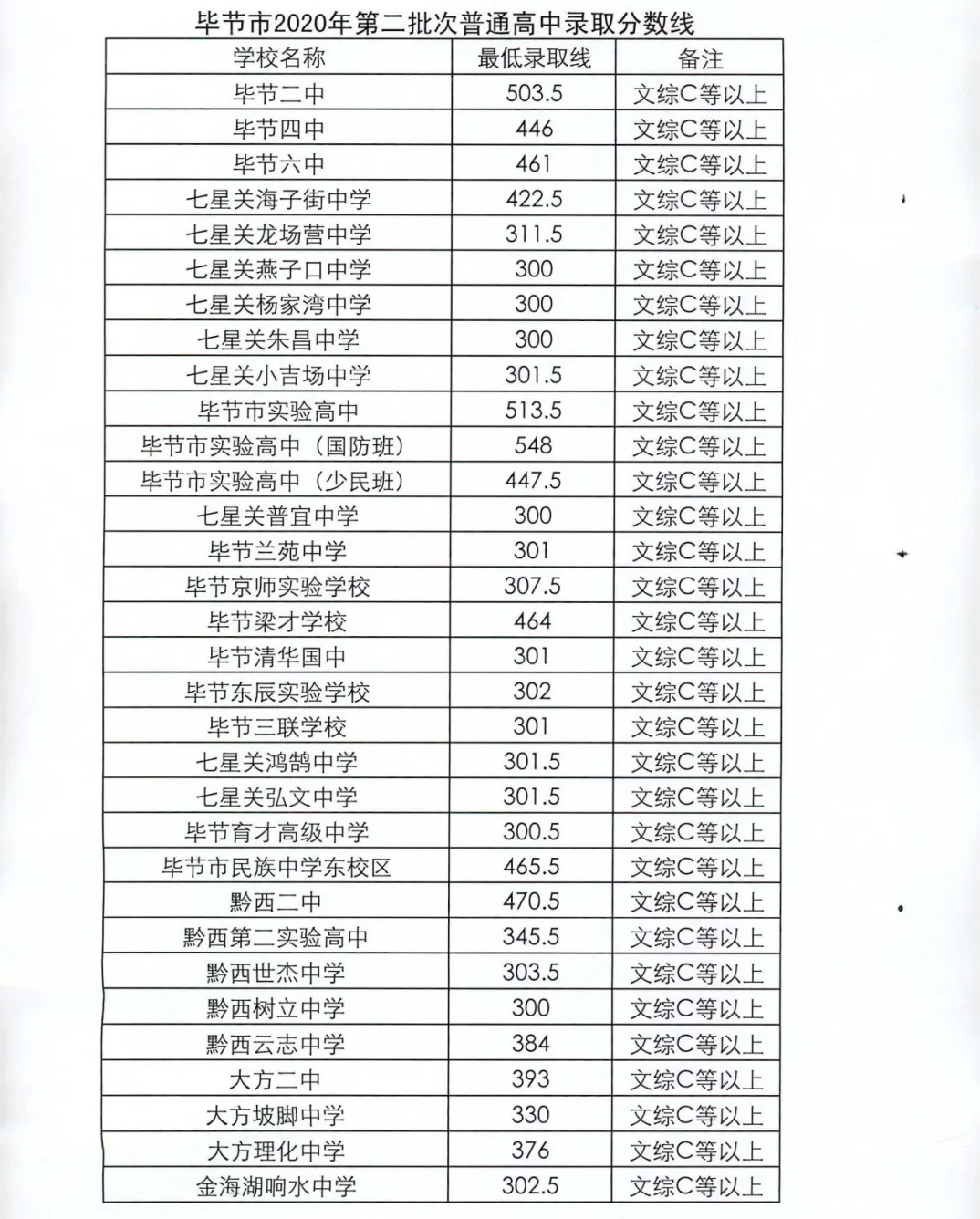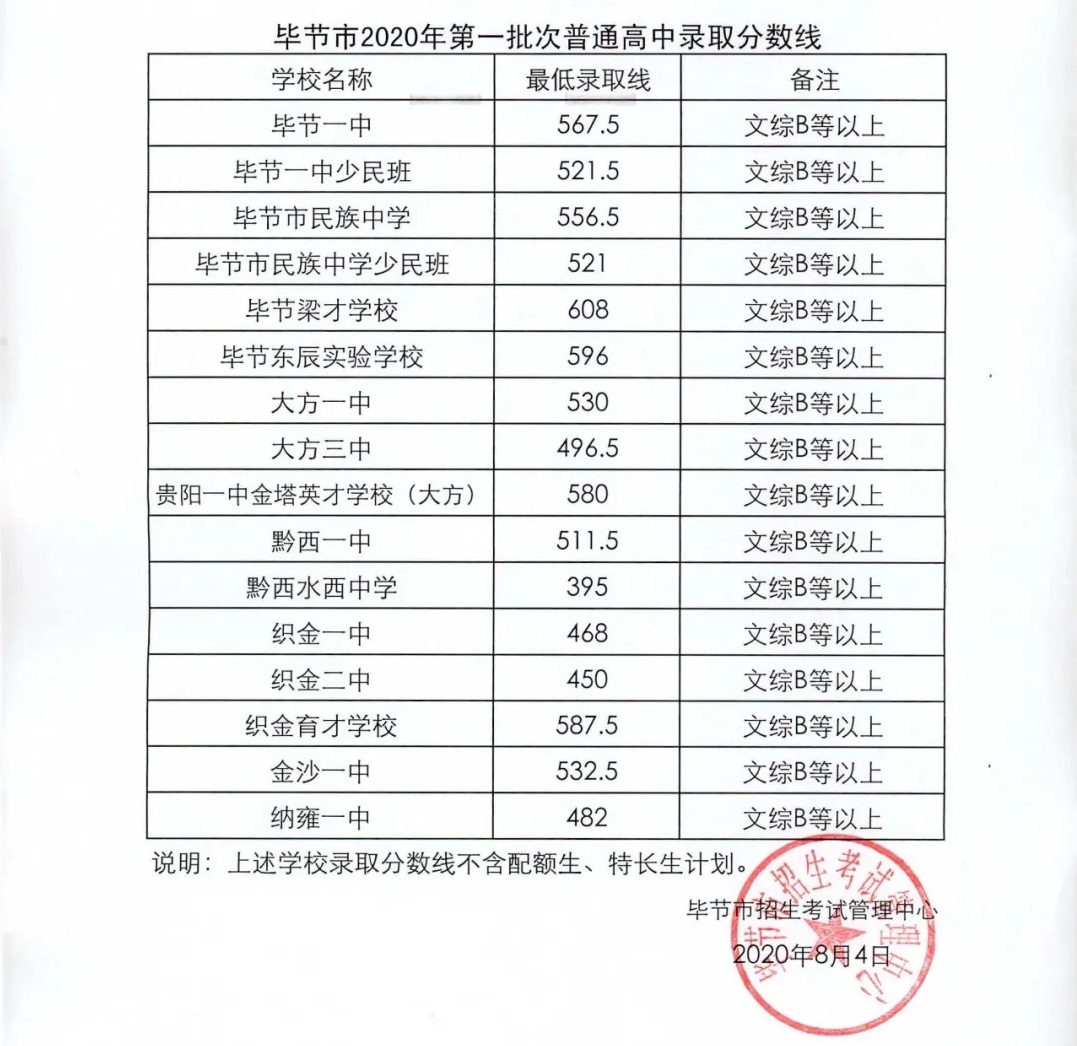 2020毕节录取分数线
