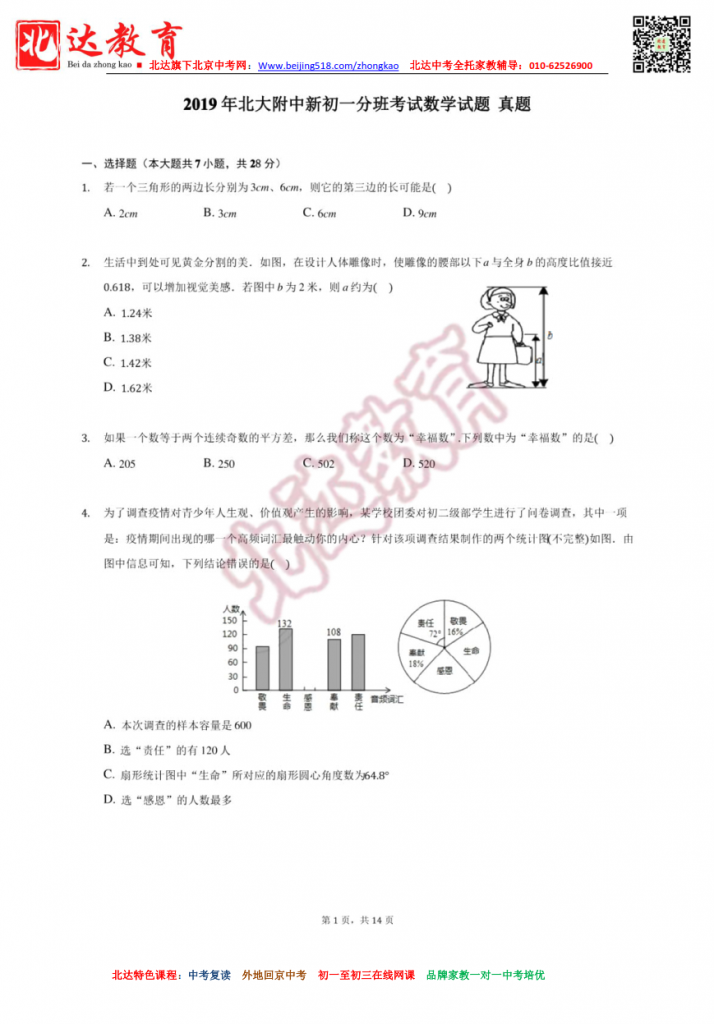 北大附中2019新初一分班考试数学试题及答案。admw360中考复读学校教研组收集整理,分享给大家。