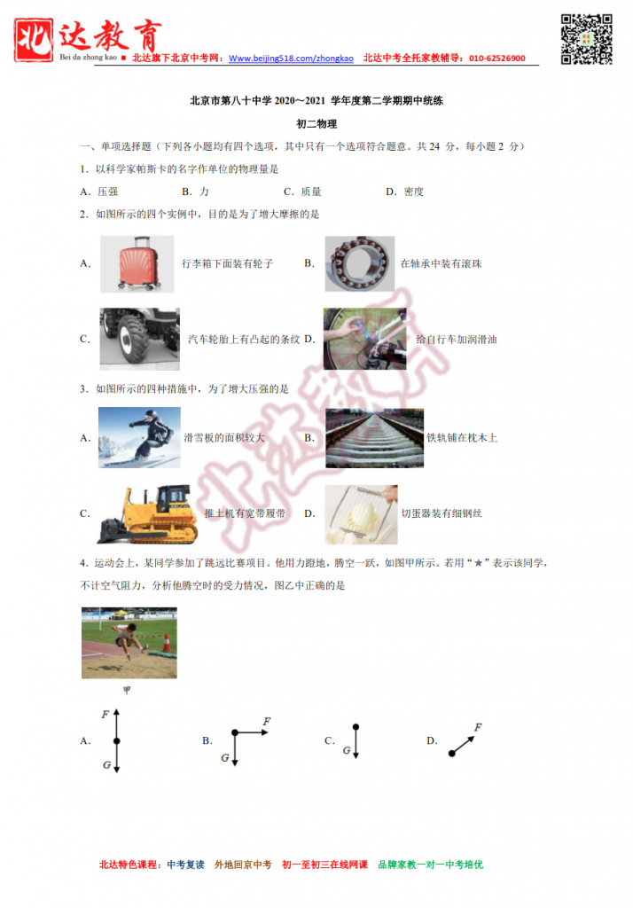 北京八十中学2021初二下期中考试物理试题。admw360中考复读学校教研组收集整理,分享给大家。