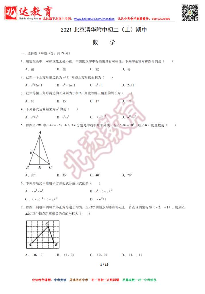 清华附中2021初二上期中数学试题及答案。admw360中考复读学校教研组收集整理,分享给大家。