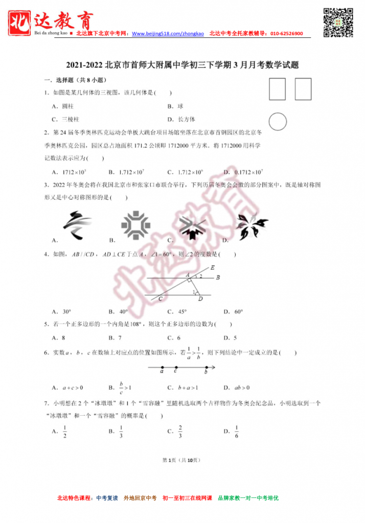 首师附中2022初三3月月考(零模)数学试卷。admw360中考复读学校教研组收集整理,分享给大家。