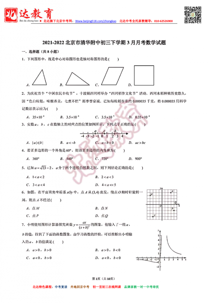 清华附中2022初三下3月月考数学试题。admw360中考复读学校教研组收集整理,分享给大家。