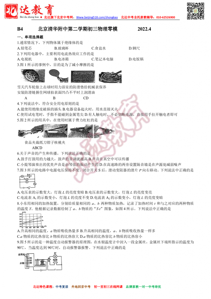 清华附中202204初三零模物理试题。admw360中考复读学校教研组收集整理,分享给大家。