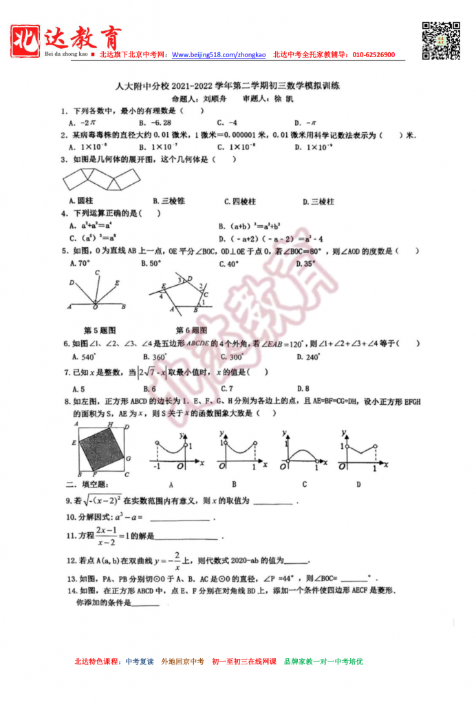 北京人大附分校2022年4月初三数学模拟试题。admw360中考复读学校教研组收集整理,分享给大家。