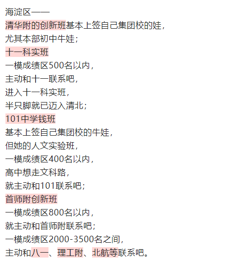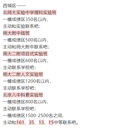 2、部分考生可通过一模成绩提前签约上岸。一模取得理想成绩的同学会被本校或其他各校关注,可以签实验班,提前上岸,为中考加上一道双保险。(文章后面给大家汇总了海淀西城等区的实验班签约信息)