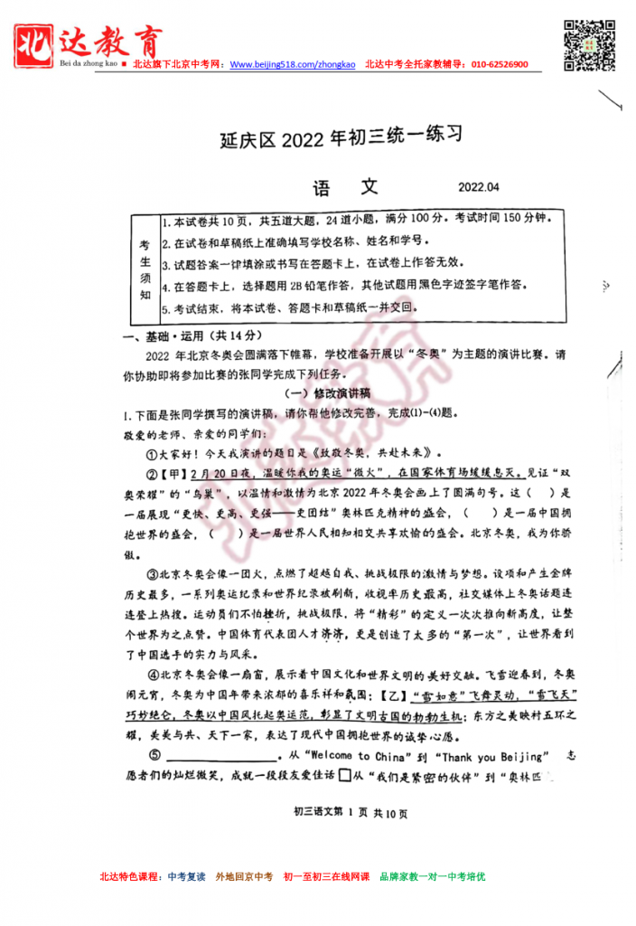 北京延庆区202204初三零模语文试卷。admw360中考复读学校教研组收集整理,分享给大家。