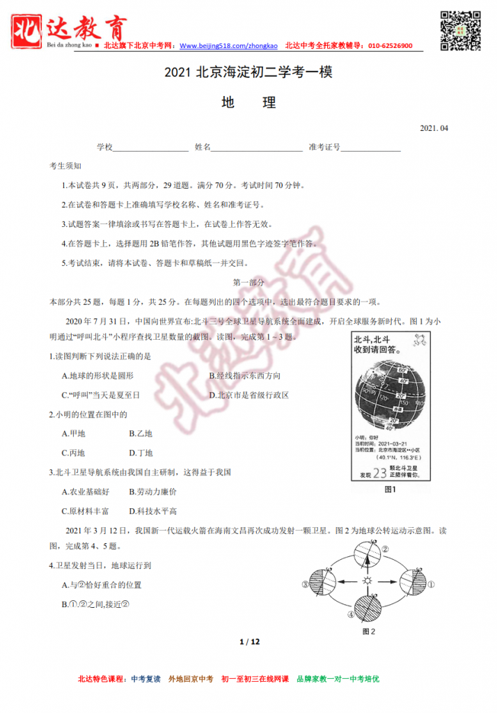 北京海淀2021初二学考一模地理(教师版)。admw360中考复读学校教研组收集整理,分享给大家。