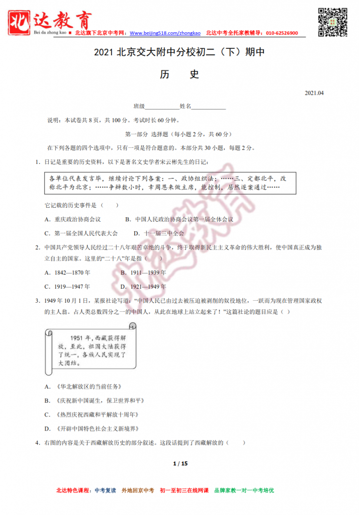 北京交大附中2021初二下期中历史试题及答案。admw360中考复读学校教研组收集整理,分享给大家。
