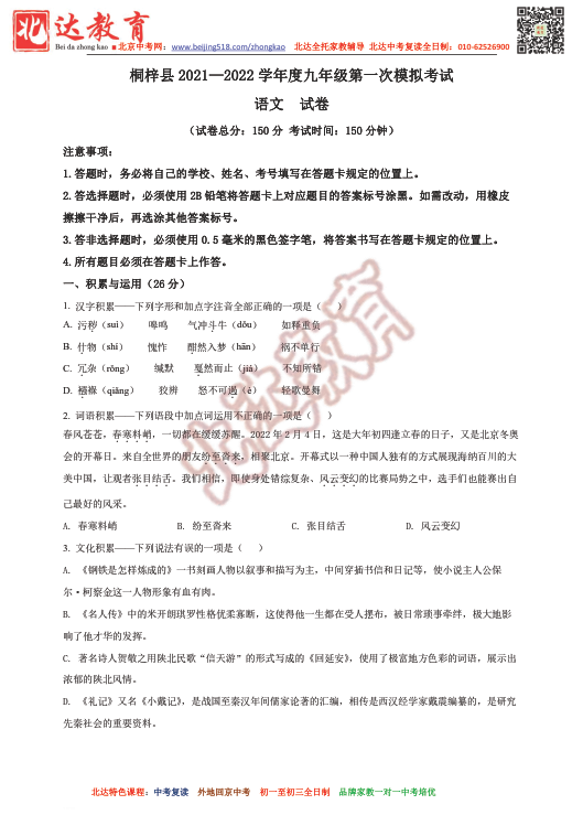 2022年贵州省桐梓县中考一模试卷及解析(高清版)。admw360教研组收集整理,分享给大家。