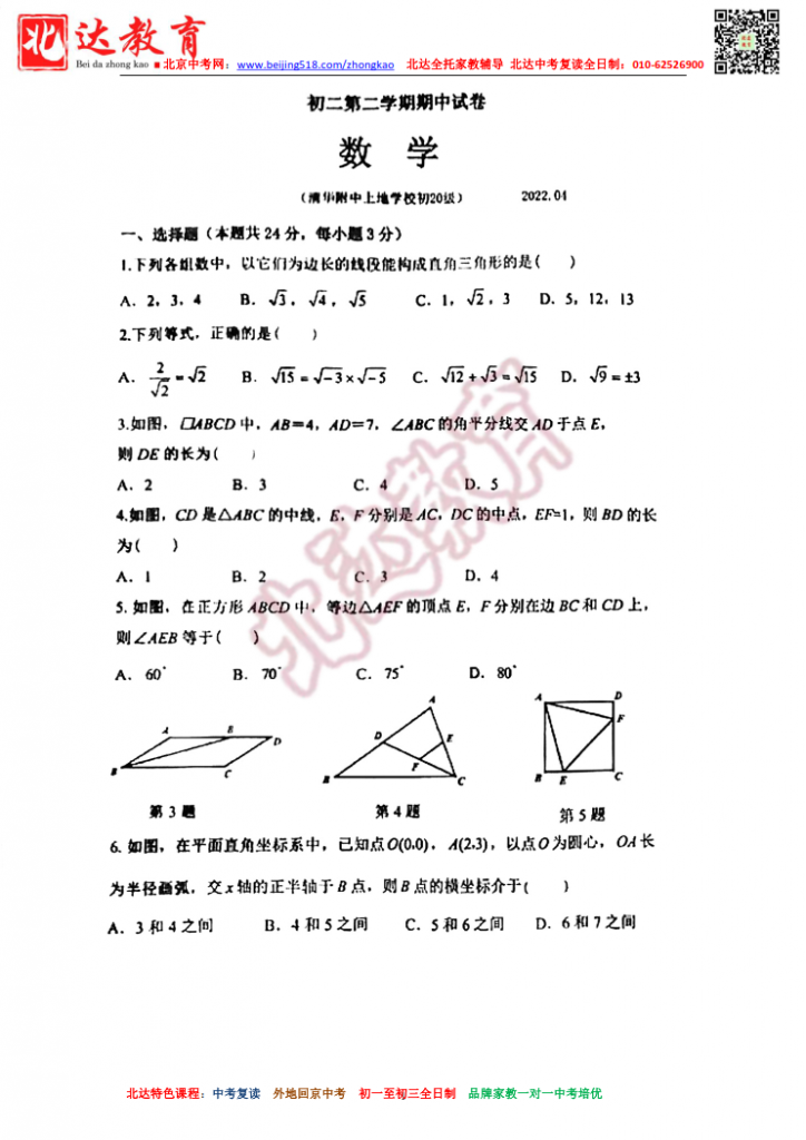 北京海淀2022初二下期中数学试卷(高清版)。admw360中考复读学校教研组收集整理,分享给大家。