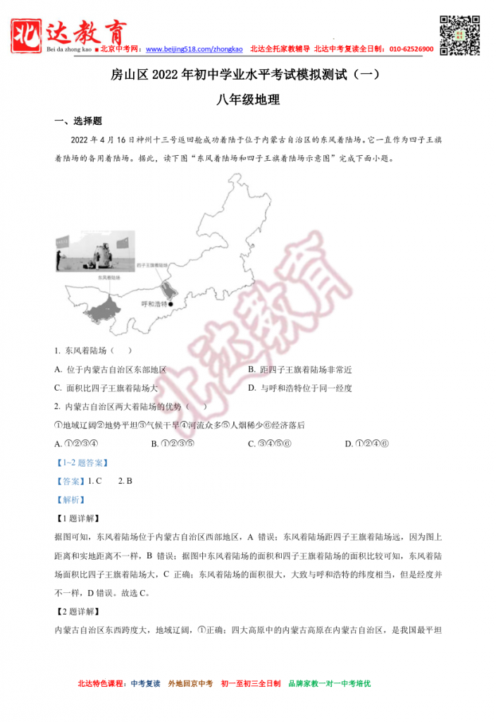 北京房山2022初中一模地理试卷及解析(高清版)。admw360中考复读学校教研组收集整理,分享给大家。