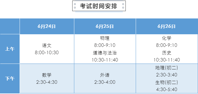中招总分660分中,语文试卷总分值为100分,数学试卷总分值为100分,外语总分值为100分(卷面成绩60分,听力口语成绩40分),听力口语考试采取计算机考试方式,与统考笔试分离,有两次考试机会。物理(含开放性科学实践活动10分)、化学(含开放性科学实践活动10分)、生物(含开放性科学实践活动10分)、道德与法治(含综合社会实践活动10分)、历史(含综合社会实践活动10分)、地理(含综合社会实践活动10分)六门科目分值均为80分。初三年级文化课考试时间为6月24日至26日上午,初二年级文化课考试时间为6月26日下午。体育与健康科目满分40分,其中现场考试30分,过程性考核10分。