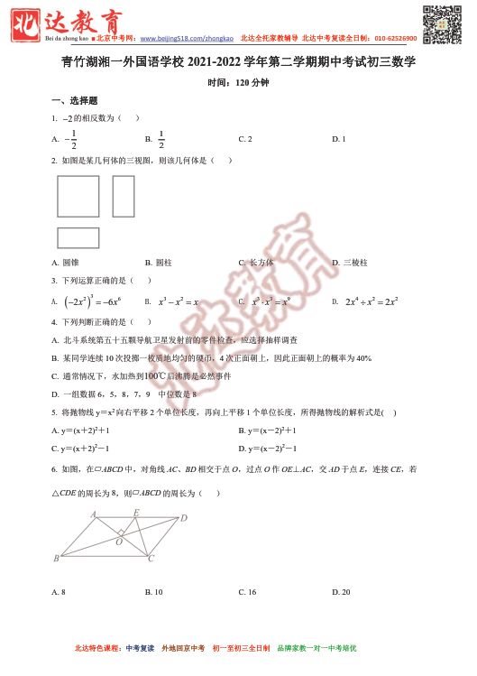 2022年湖南省长沙市青竹湖湘一外国语学校中考一模数学试题
