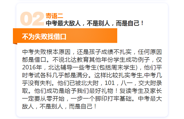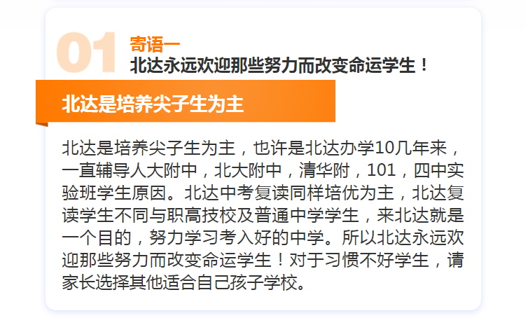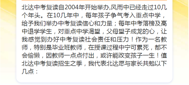 admw360中考复读严把招生关,中复招生一直采取宁缺毋滥原则,严格班级管理以确保优秀的班风,每年均有相当部分中考复读生考取人大附、四中的辉煌成绩连年中考复读招生完成招生数量和教学质量双丰收!