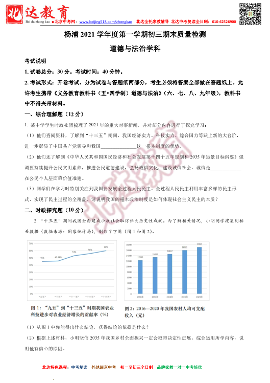 2022年上海市杨浦区中考一模道德与法治试题及答案