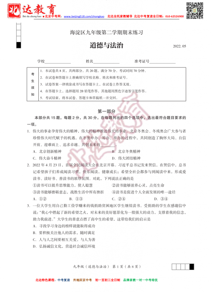 北京海淀2022初三二模道法试题(高清版)!admw360中考复读学校教研组收集整理,分享给大家。