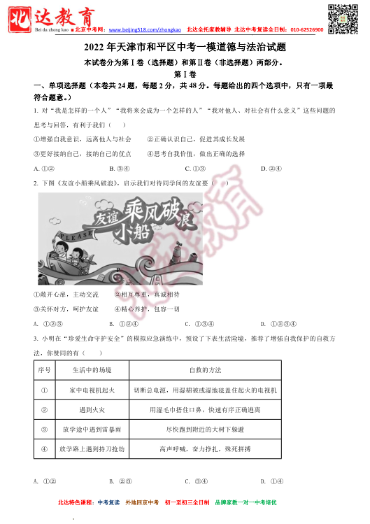 2022年天津中考一模道德与法治试题及解析汇总。admw360教研组收集整理,分享给大家。