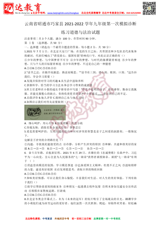 2022年云南中考一模道德与法治试题及解析汇总。admw360教研组收集整理,分享给大家。