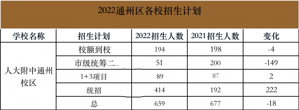 2022年人大附通州校区2022年总的招生人数比2021年减少18人。